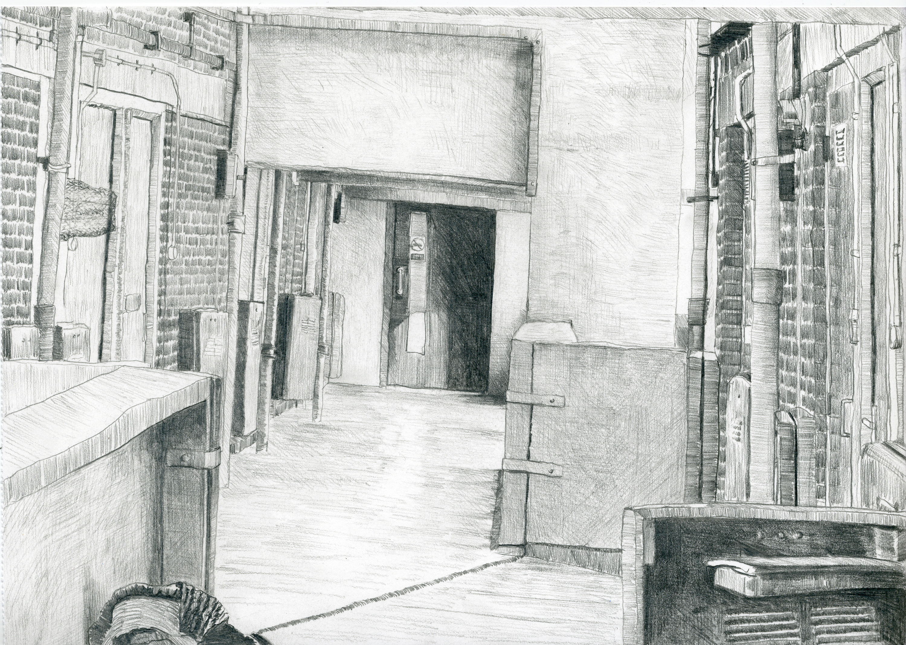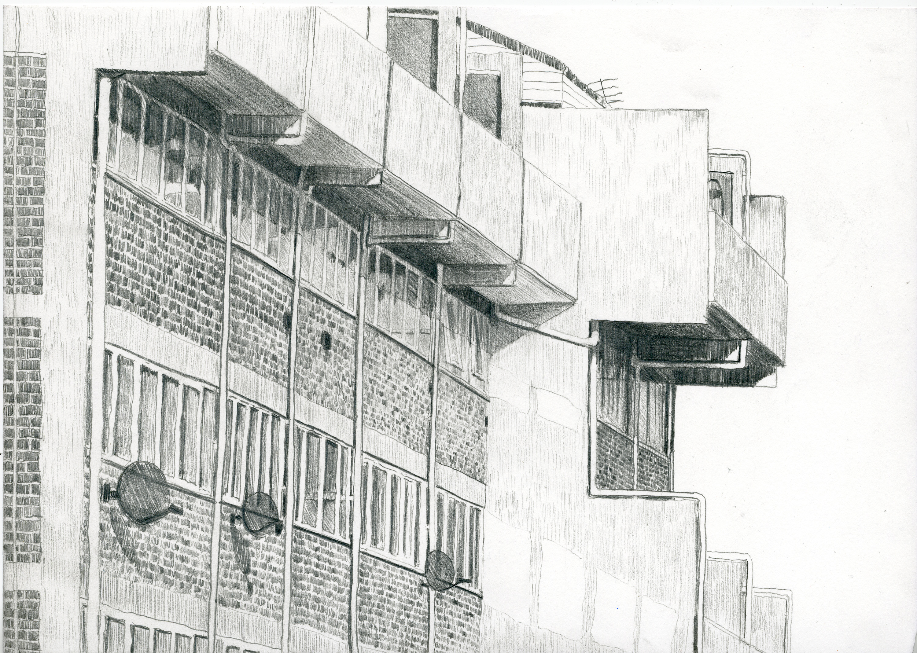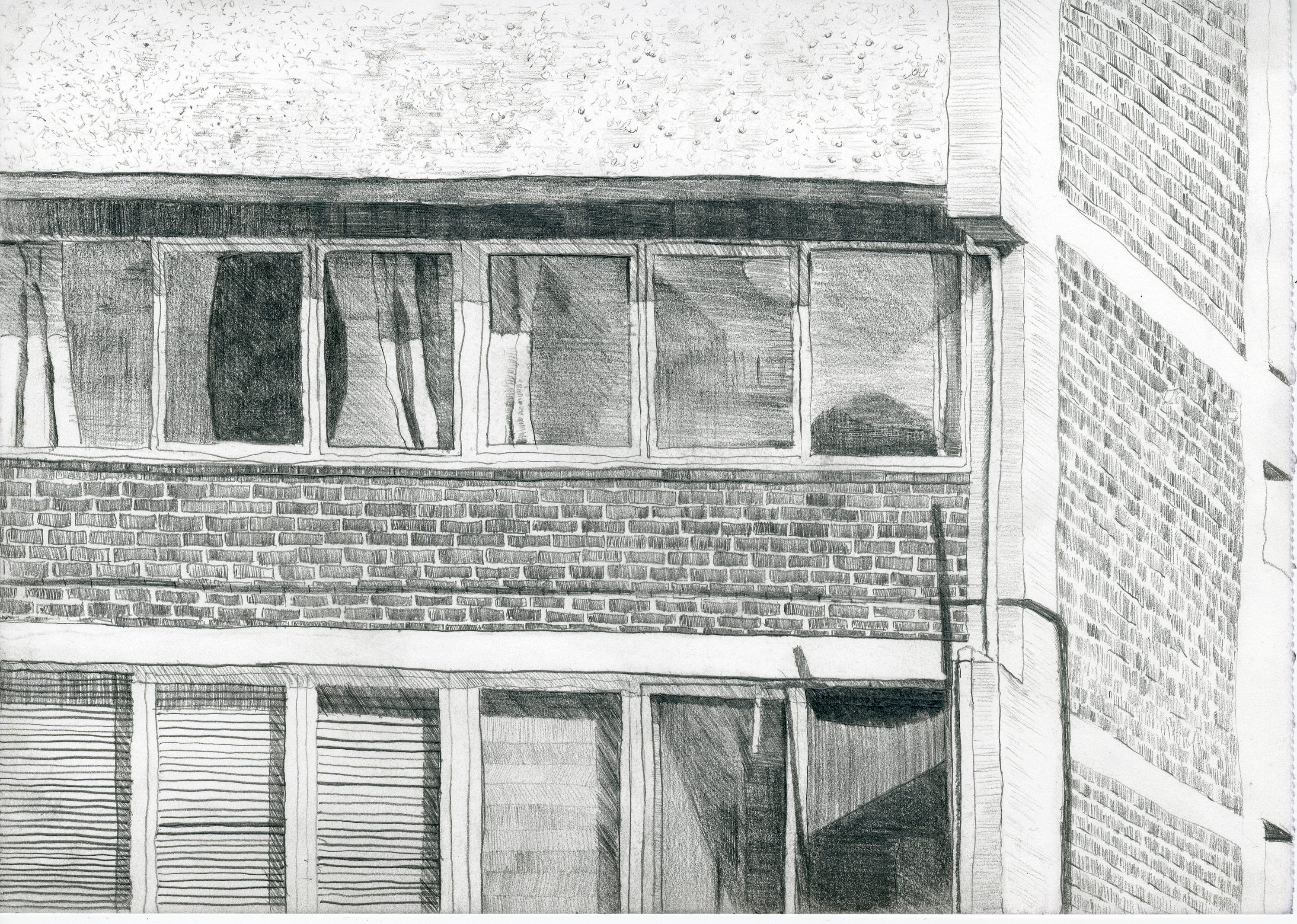 I submitted 6 drawings to the Derwent Artprize. Four of which I was lucky enough to have shortlisted. Their theme was an exploration of my own living space – how the building looks to an outside viewer and how I feel about it. All images are pencil on paper and Approx A4 Size